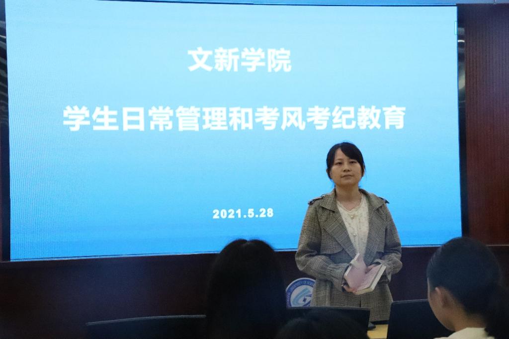 2021年5月28日晚6点30分,全院各班级组织召开了学生日常管理和考风考纪教育会议。文新学院党总支副书记刘莎发表讲话,随后院团委书记吴笛开展学生日常管理和考风考纪教育,院主要班团干部参与。