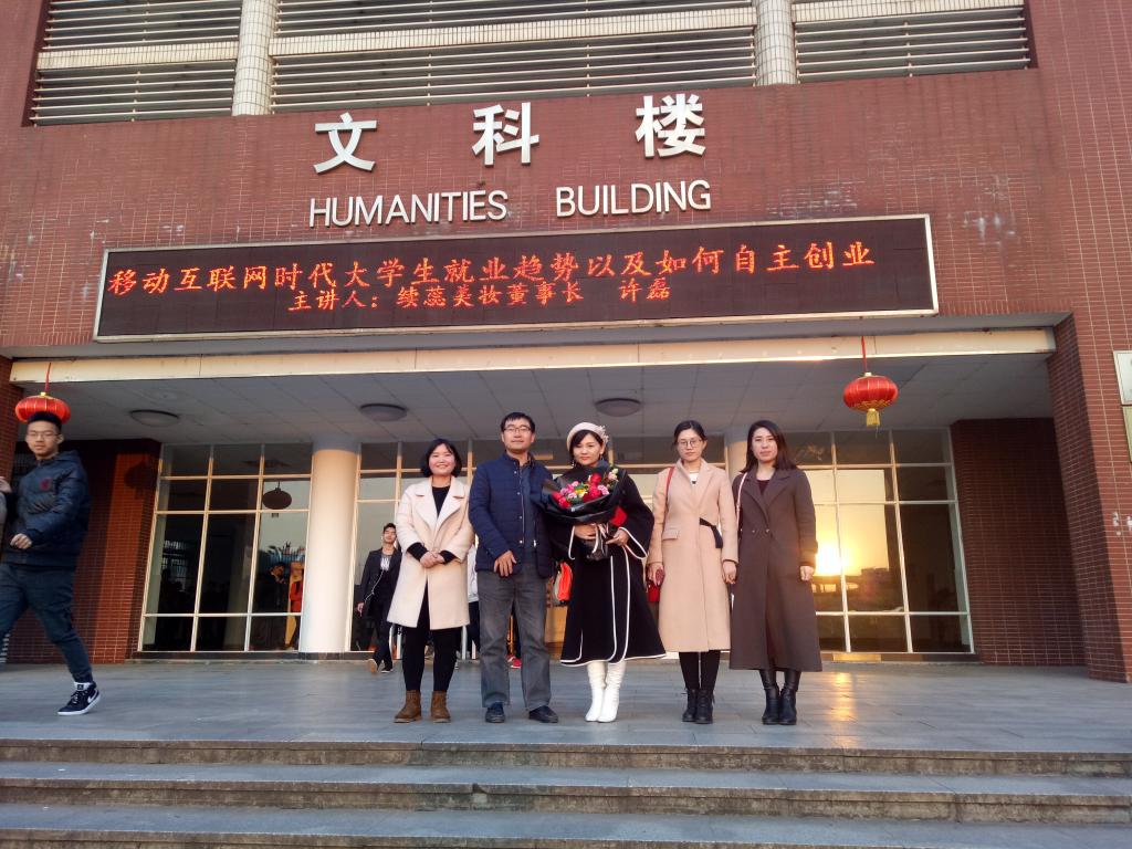 2017年12月19日下午,上海续蕊美妆公司董事长、云顶国际vip8866优秀校友许磊女士为学院学生作《移动互联网时代大学生就业趋势及如何自主创业》报告交流并受聘为学院创业导师,本次报告交流活动在文科楼C202举行。文法学院院长王新生、文法学院副院长周云鹏、党委副书记魏桃初以及学工办辅导员楚艳鸽老师出席本次讲座。