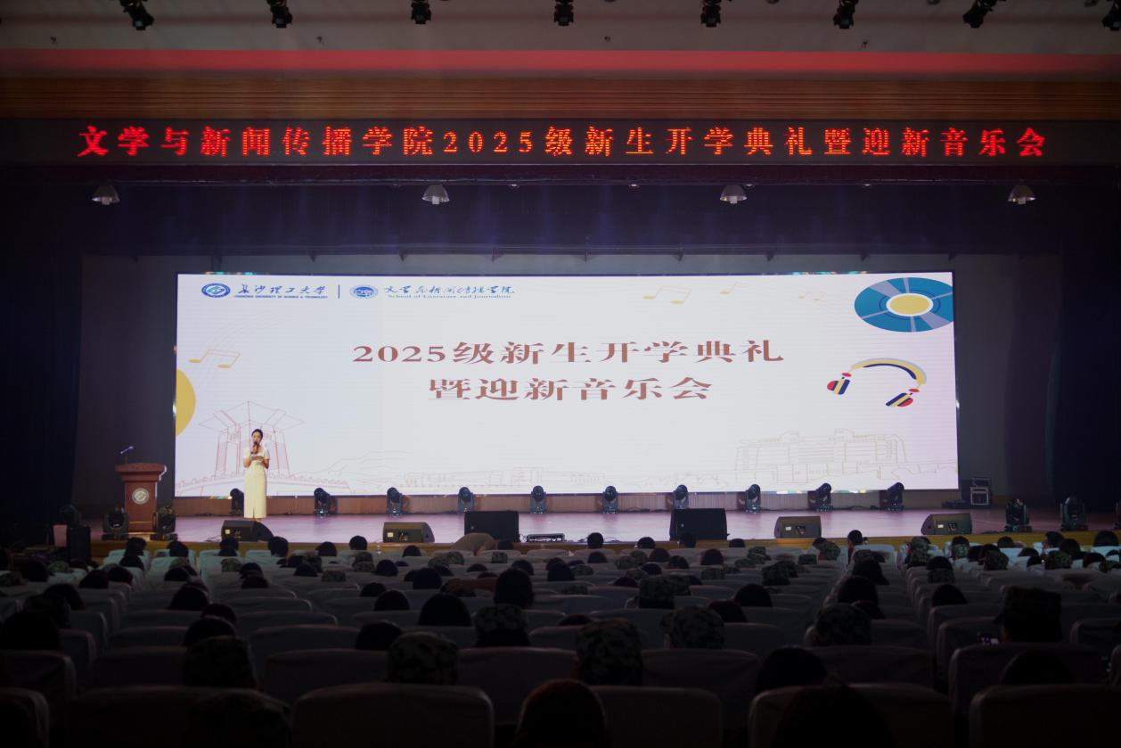 2025年9月28日晚,云顶国际vip8866文学与新闻传播学院在金盆岭校区5教大礼堂举行2025级新生开学典礼暨迎新音乐会。全体院领导、系主任、系副主任、支部书记、全体辅导员、2025级本科班级班主任以及下班党员下班团干出席活动。文新25级研究生张雨嫣、新媒体2501班王佳妮以及新闻2502班粟嘉淇担任主持。