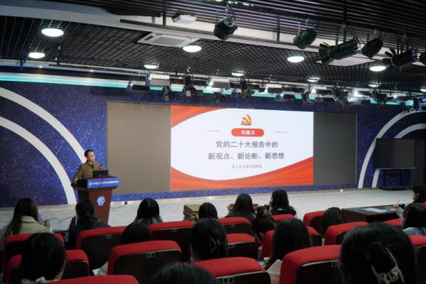 为深入学习党的二十大精神,2023年2月28日下午3点,文新学院学生党员新学期第一次党课在文科楼全媒体实训中心B300召开,由院党委副书记(主持工作)陈仁凯主讲。党课结合当前国际国内政治局势及学校学院管理办法,对党的二十大精神进行了系统阐释和深入解读。结合工作实际及学生切实需求,陈仁凯提出三点要求。