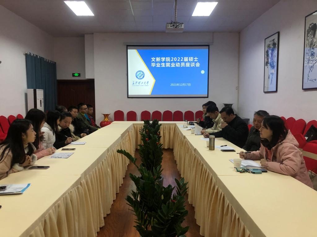 12月17日上午,文新学院2022届硕士毕业生就业动员座谈会在金盆岭校区校友中心召开。学院院党委书记伍接朝、院长刘建新、党委副书记刘莎、副院长周云鹏、副院长王雨佳以及就业专干吴笛出席此次会议,2022届全体硕士毕业生参加。