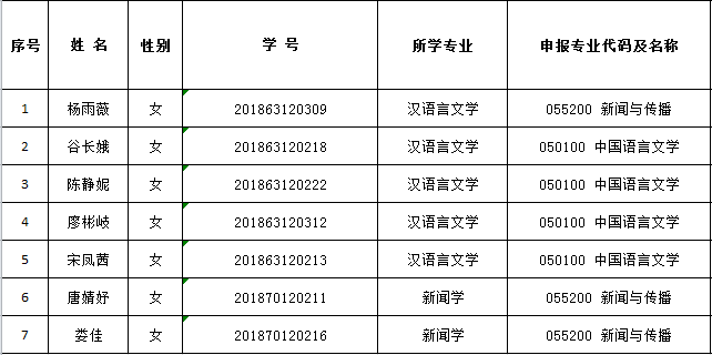 根据云顶国际vip8866研究生院《关于做好2021年研究生校内优秀生源培养工作的通知》精神,经学生申请,系资格审查,确定下列7名同学为文学与新闻传播学院2021年研究生校内优秀生源培养对象,现予以公示。公示时间:2021年9月18日-23日,如有异议,请向学院科研与研究生办公室反映,电话: 85255728。