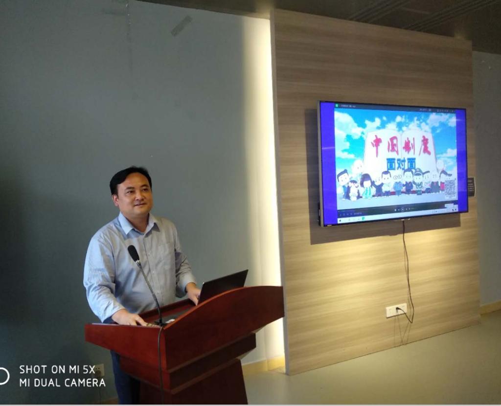 9月29日下午,系党总支组织全系教职工在文科楼B501室集中观看《中国制度面对面》微视频,系党总支书记伍接朝为教工党员上党课。系党总支班子成员出席,全体教职工参加。
