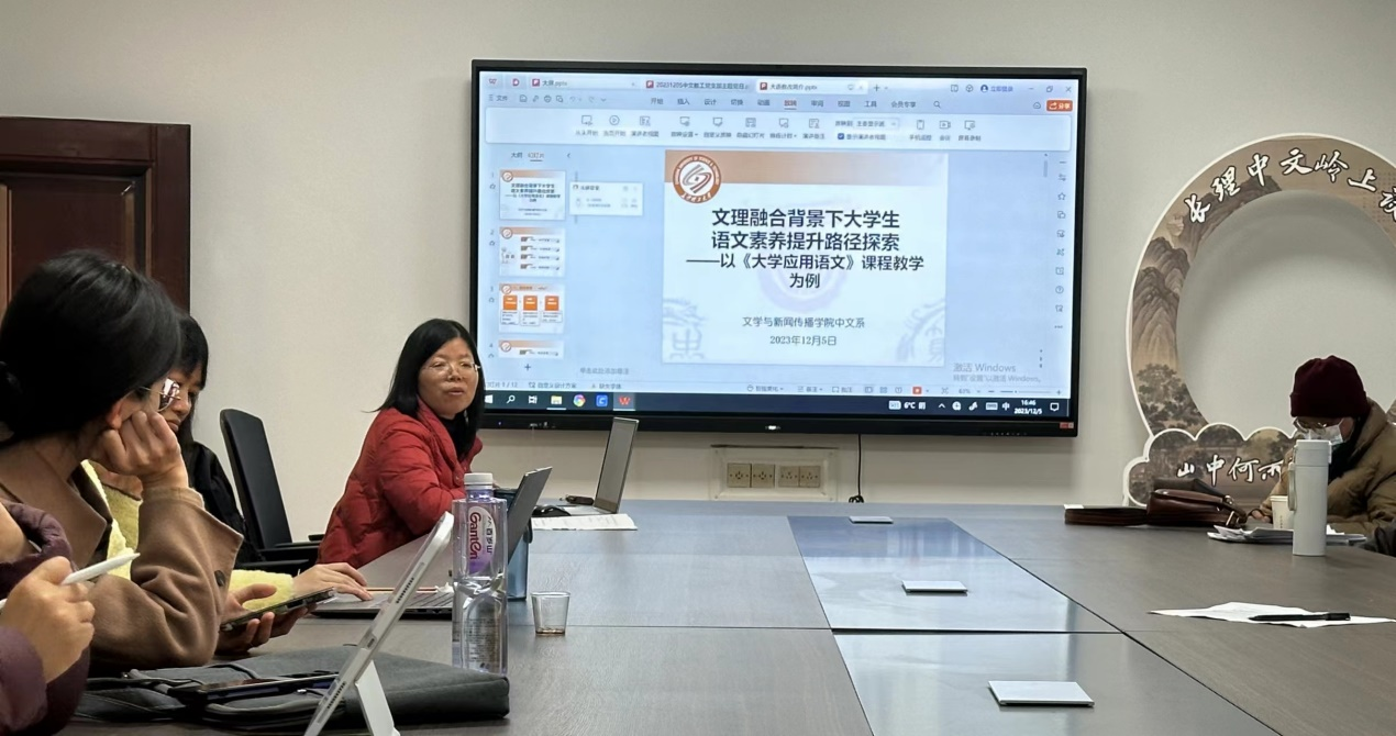 12月5日下午,中文系在金盆岭校区9教318举行“文理融合背景下大学生语文素养提升路径探索——以《大学应用语文》课程教学为例”专题教研活动。学院副院长周云鹏、院党委委员兼中文系主任郑劭荣及中文系全体教师参加了讨论,本次活动由中文系副主任周静主持。