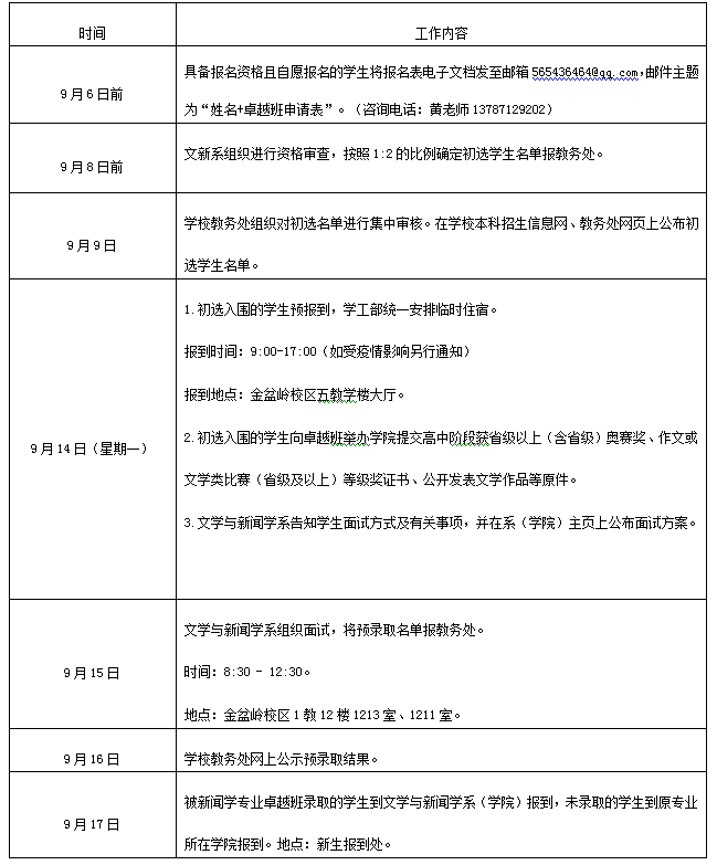 (3)符合报名条件的学生在9月6日前将报名表(word文档)以邮件附件形式发至新闻卓越试点班联系人邮箱565436464@qq.com,邮件主题为“姓名+卓越班申请表”。未在规定时间内以规定形式报名的将不予受理,报名表见附件1。