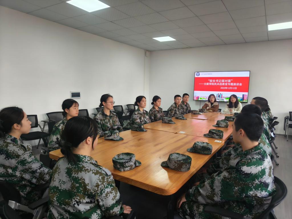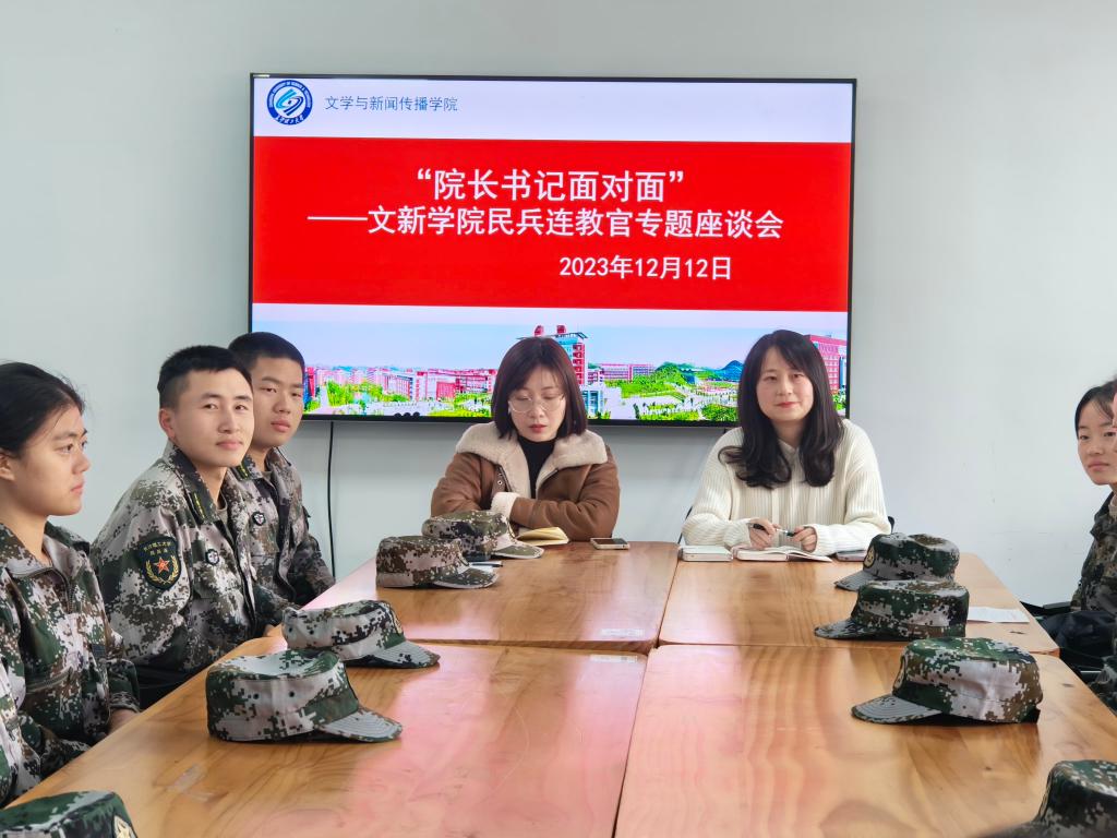 12月12日下午,为了解学院民兵连学生的生活、训练情况,关心民兵连学生们的学习成长,文新学院在九教院团委学生会办公室开展“院长书记面对面——文新学院民兵连教官”主题座谈会。院党委副书记刘莎、23级辅导员李婵出席本次座谈会,学院15名民兵连学生参加会议,会议由黄一源同学主持。