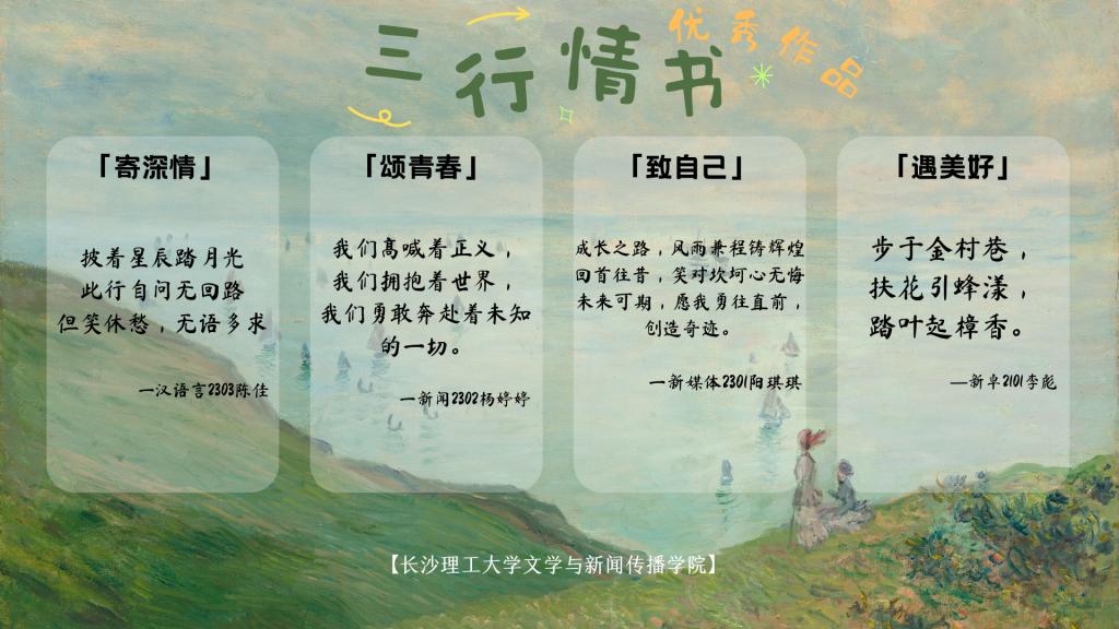 本次活动面向文新学院全体学生,旨在用三行文字捕捉大家深藏心底的情感。活动主题共分为寄深情、颂青春、致自己、遇美好四个专区。活动一经推出,便吸引了众多同学的积极参与,共征集了77篇稿件,并邀请了新闻系曾志华老师作为评委,参与作品评选。新卓2301班郭悦茹对此次活动发表了感想:“三行情书虽然简短,但却能直击人心。它让我们明白,感情并不一定要长篇大论,有时候最简单的文字,反而能表达出最深沉的情感。”