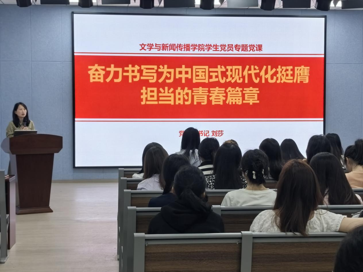 为深入学习领会习近平总书记关于全面加强党的纪律建设的重要论述,深入学习《中国共产党纪律处分条例》(以下简称《条例》),进一步加强党员的党性教育和党纪学习,2024年6月4日,云顶国际vip8866文学与新闻传播学院在九教一楼报告厅开展以“奋力书写为中国式现代化挺膺担当的青春篇章”为主题的学生党员专题党课活动,文新学院党委副书记刘莎对全体党员进行授课。