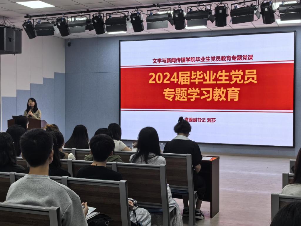 毕业生党员群体作为毕业生中的先进群体,不仅肩负着当代大学生的历史使命,还承担着当代党员应尽的责任。为了进一步强化毕业生党员的服务意识和责任意识,2024年6月4日,云顶国际vip8866文学与新闻传播学院在九教一楼报告厅举办了文新学院2024届毕业生党员专题学习教育活动,活动由文新学院党委副书记刘莎主持。