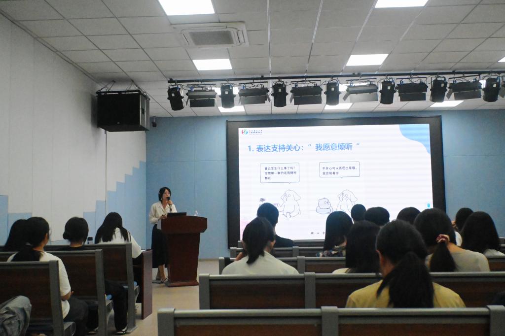 6月6日晚七点,文新学院在金盆岭校区九号教学楼113新闻演播厅开展2023级朋辈互助员培训会议第二讲。此次培训由云顶国际vip8866心理健康教育中心卢灵舢老师主讲,23级朋辈心理互助员参加。