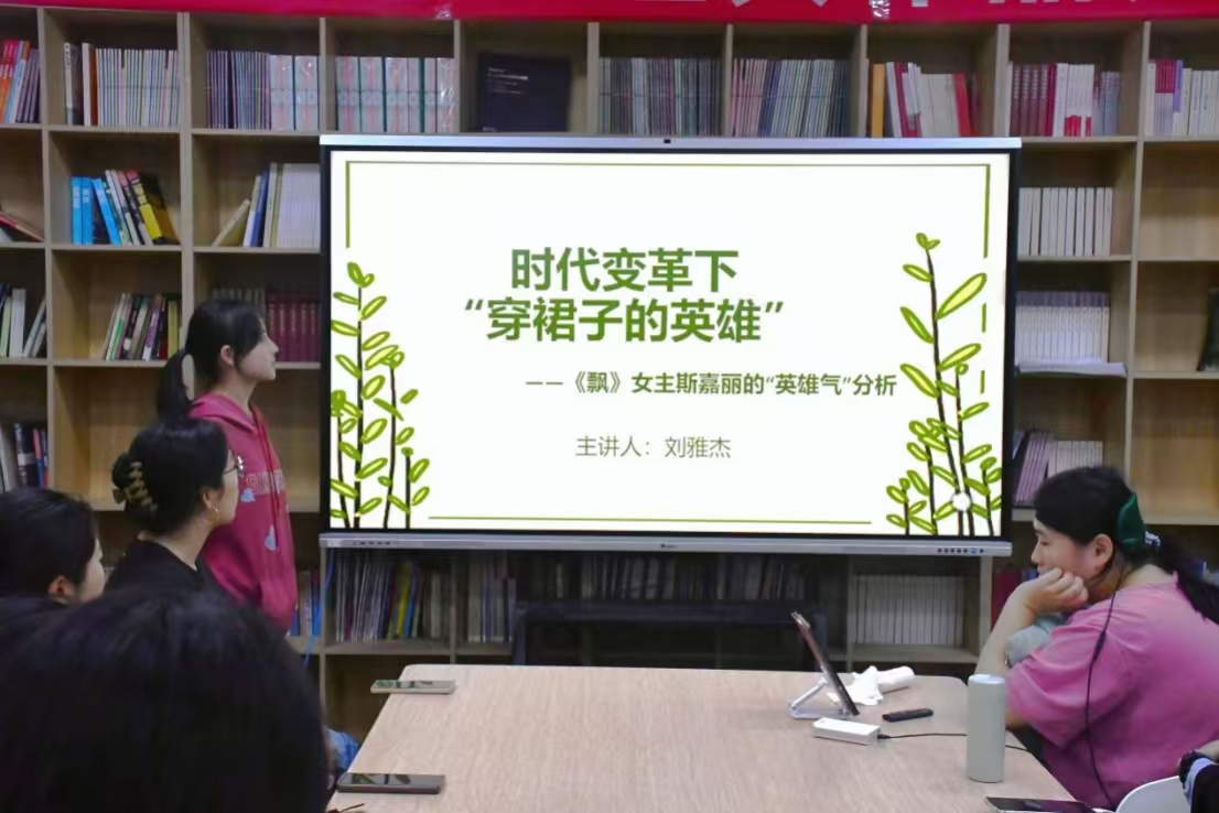 分享会中,刘雅杰从前言、对自我权力的清晰认知、敢于打破自我能力的局限、总结四个方面向大家展示了《飘》女主斯嘉丽身上的“英雄气”,题材新颖,引人深思。在互动环节,同学们踊跃提问,畅所欲言 积极分享自己对于“斯嘉丽”的看法,现场气氛愉悦。