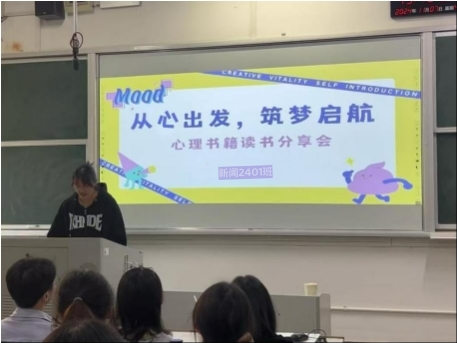 为帮助同学们更好地适应大学生活,增强心理素质,11月7日,新闻2401班在12教107教室开展了以“从心出发,筑梦启航”为主题的心理读书分享会。本次活动由班级心理委员组织,班级全体同学参与。