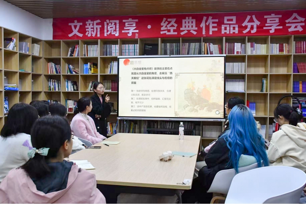 11月22日晚,我院第十二期“文新悦享·经典作品分享会”在九教317师生发展中心如期举行。汉语言2201班贺丽芳以“穿梭古今的人际交往和职场生存智慧指南”为题,分享了青年作家马伯庸新作《太白金星有点烦》。中文系教师曾真作为特邀嘉宾出席此次活动。
