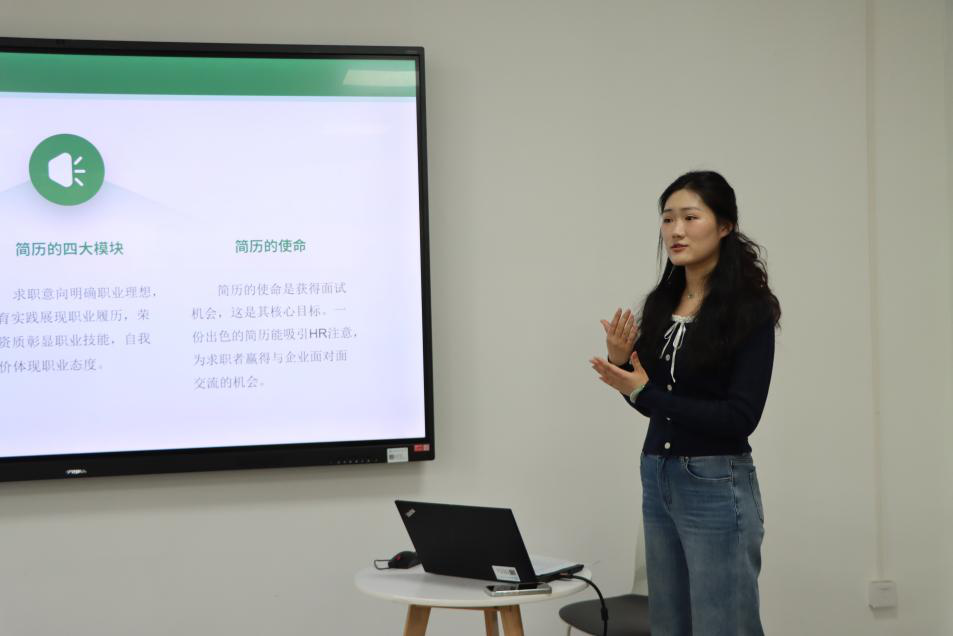 互动环节中,有同学提问“跨专业求职如何突出简历亮点”,丁璇建议从课程论文、学科竞赛等角度体现可迁移的研究与分析能力。还有同学就“实践经历较少如何提升简历竞争力”寻求建议,丁璇结合案例指出可通过细化校园活动成果,如“统筹50人团队完成校级赛事策划”,展现执行与协作素养。