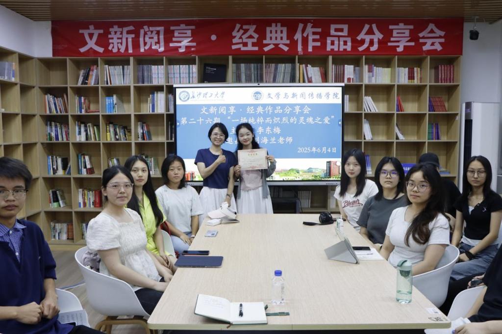 6月4日晚,我院第二十六期“文新阅享.经典作品分享会”在云顶国际vip8866金盆岭校区九教317师生发展中心举行。主讲人汉语言2404班李东梅以“一场纯粹而炽热的灵魂之爱”为主题,深入探讨夏洛蒂·勃朗特的《简·爱》,中文系教师刘海兰作为特邀嘉宾出席。