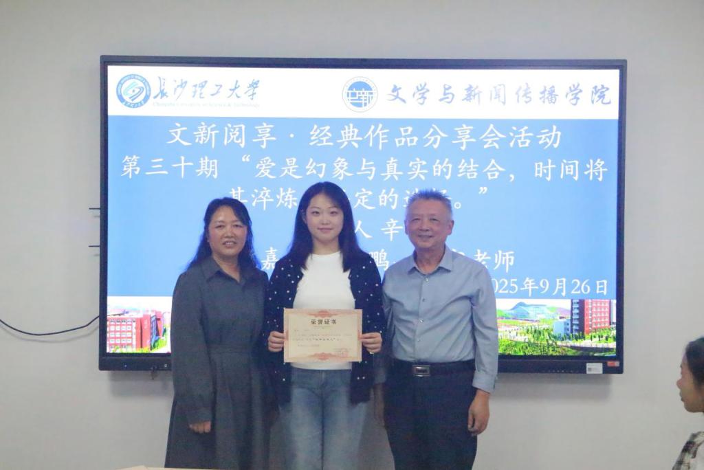 活动尾声,周云鹏、黄宇老师为辛悦颁发证书并合影留念。本次分享会不仅为同学们搭建了思想碰撞与文学交流的平台,也进一步拓展了大家对爱情、人性与生命价值的理解,激励每一位参与者始终保持对生活与爱情的热望与信念。