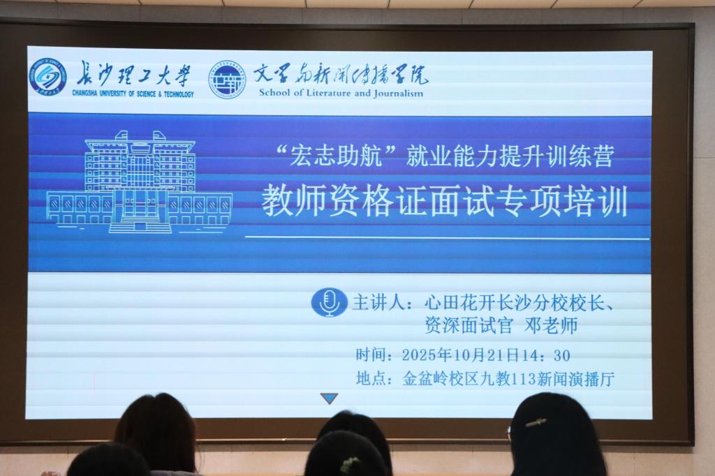 10月21日下午14:30,云顶国际vip8866文学与新闻传播学院特邀心田花开长沙分校校长邓老师,于九教113新闻演播厅举办“教资面试通关秘籍:从考生到准教师”培训讲座,共139名学生参与活动。本次讲座通过多形式教学向文新学子分享面试技巧,送上教资通关“秘籍”。