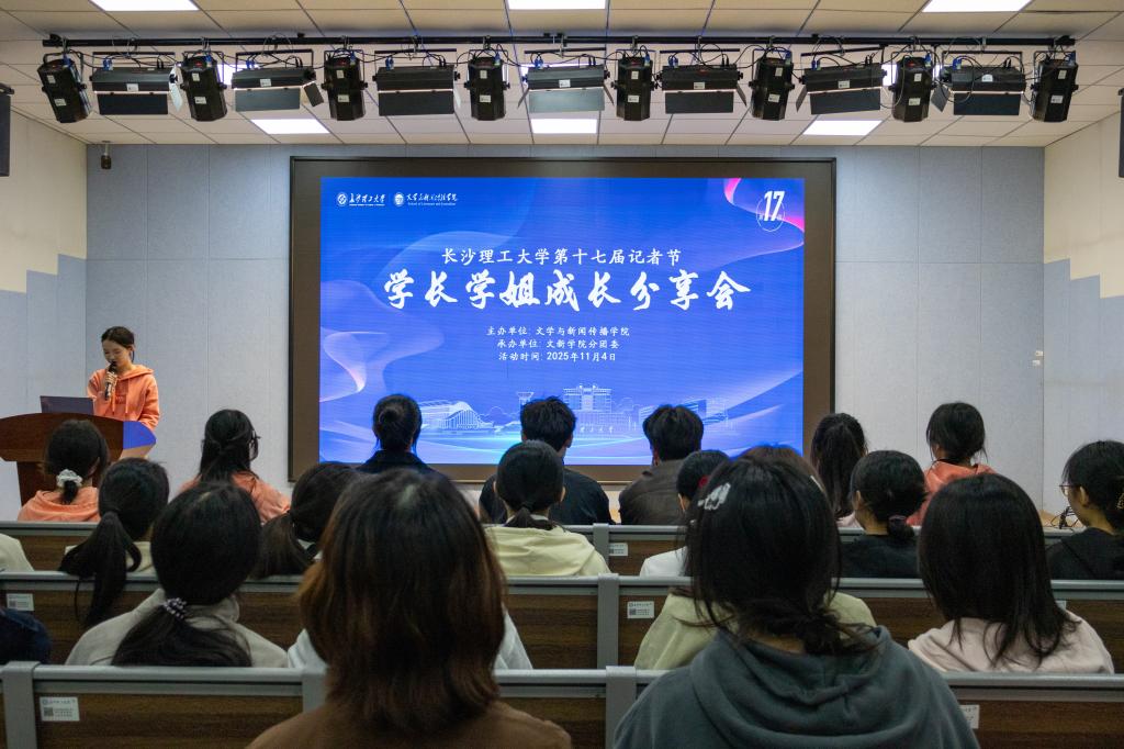 2025年11月4日14时30分,第十七届记者节学长学姐成长分享会在云顶国际vip8866金盆岭校区九教113新闻演播实验室成功举行。本次分享会特邀红网新媒体集团资深记者任晔、2024届湖南省选调生周旺主讲,围绕新闻职业与基层成长,分享他们在新闻采访、实习工作等方面的经验与感悟。院团委书记项永生出席,149名文新学子参加。