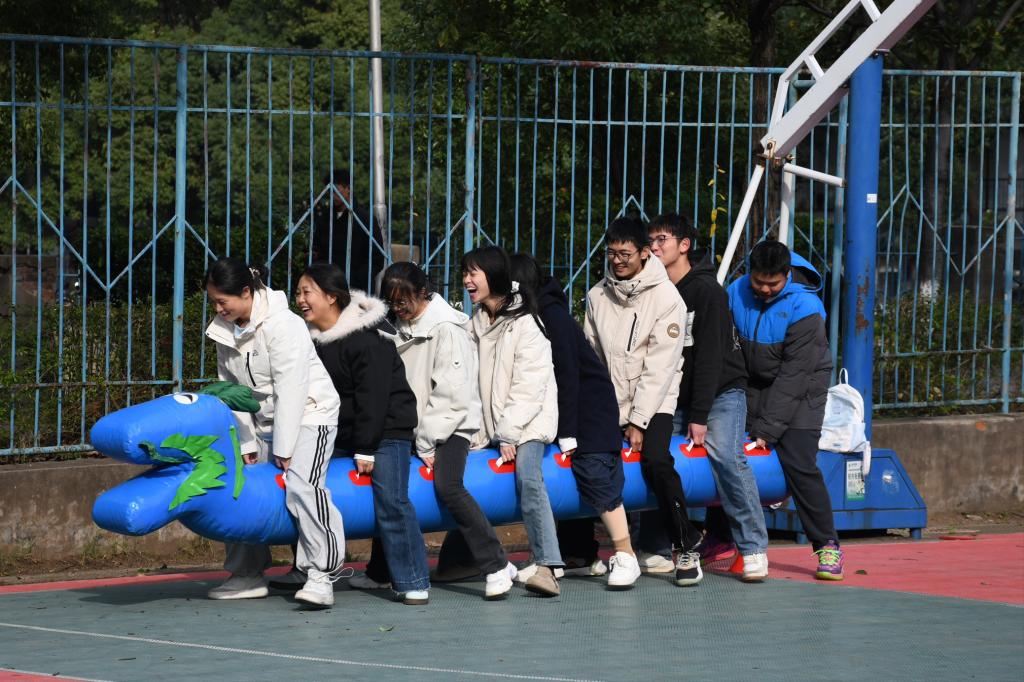 此次活动共设置“龙舟竞速”“珠行万里”“呼啦圈传递”“搬石过河”“九人十足”五个富有趣味性与协作性的团队游戏项目。活动开始前,李心怡进行开场讲话,鼓舞同学们的士气。接下来,同学们在紧张激烈的氛围中积极投入、默契配合,进一步增进了彼此的情谊。现场气氛热烈,游戏环节互动丰富,充分展现了新生的活力与朝气。来自汉语言2502班的唐莹莹同学表示:“一开始大家还有些拘谨,但通过几个游戏的共同努力,我们迅速熟悉起来。比如进行‘珠行万里’时,当小球顺利抵达终点,我们都在为自己小组的成功欢呼。”