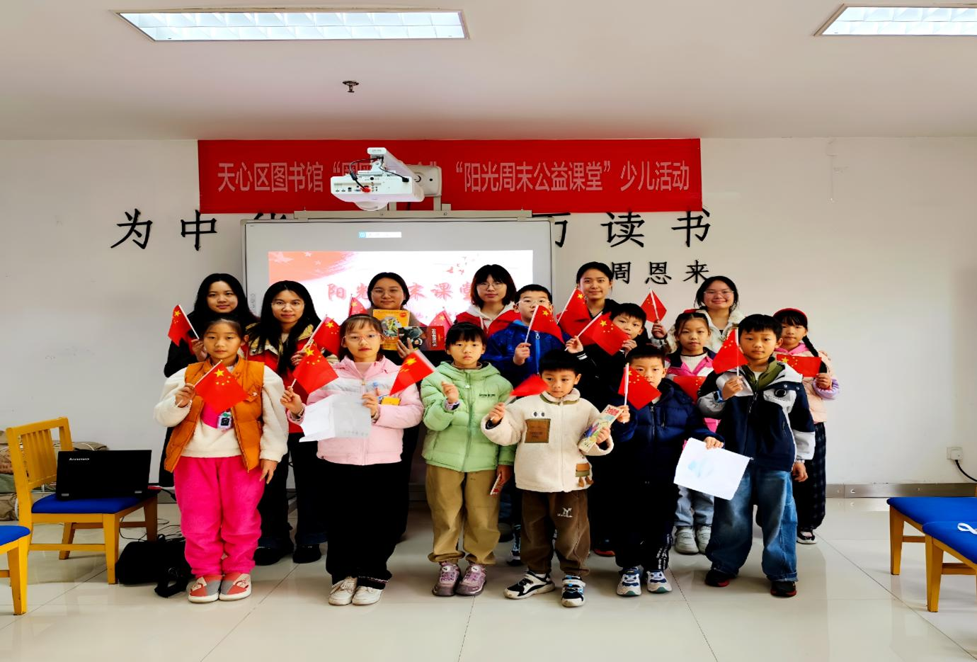 12月20日上午,第三十七期阳光周末公益课堂在天心区图书馆开讲。本次课堂以“国歌响天地,精神励后人”为主题,志愿者们通过讲述国歌背后的历史故事,引导孩子们感受其中蕴含的民族精神,激发对祖国的深厚情感。