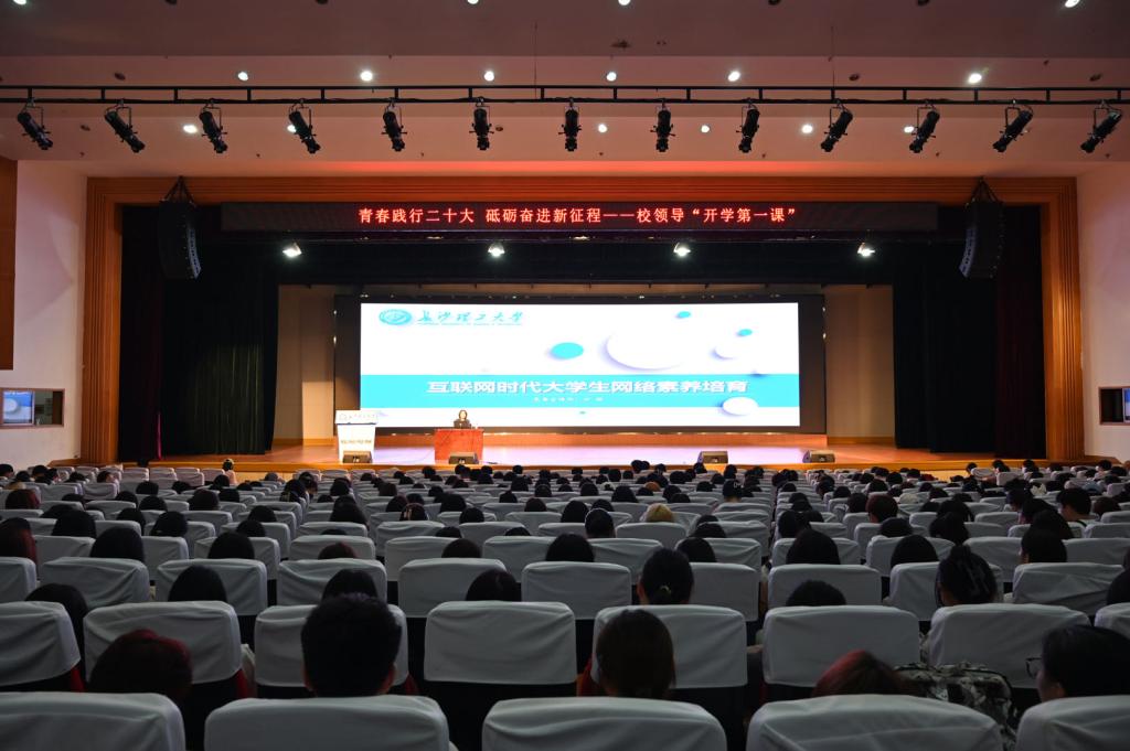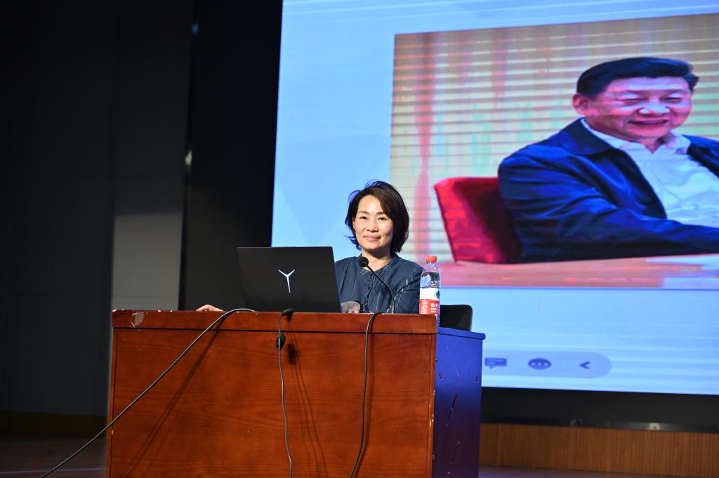 4月20日晚,校党委委员方琼在金盆岭校区五教大会堂为文新学院学生讲授“青春践行党的二十大、砥砺奋进新征程”开学第一课。院领导刘建新、陈仁凯、刘莎等出席。
