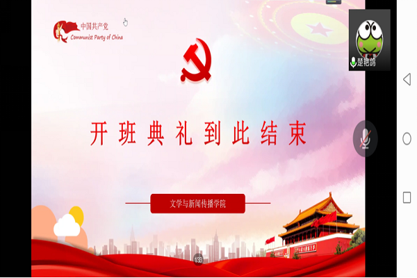 4月14日晚7点,文学与新闻传播学院以线上方式举办本学期入党积极分子、发展对象、预备党员培训班开班仪式。学院党委副书记刘莎、党建辅导员楚艳鸽以及全部学员参加本次开班仪式,仪式由苏依璐同志主持。
