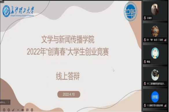 2022年4月10日晚,文学与新闻传播学院成功举办2022年“创青春”大学生创业竞赛院内选拔线上答辩会。答辩会由学创部组织,共有12个项目团队参赛。本次答辩会分为参赛项目队伍自主5分钟汇报展示与评委老师点评提问两个环节。副院长王雨佳、新闻专业老师王春晓、院团委书记李敏担任评委。