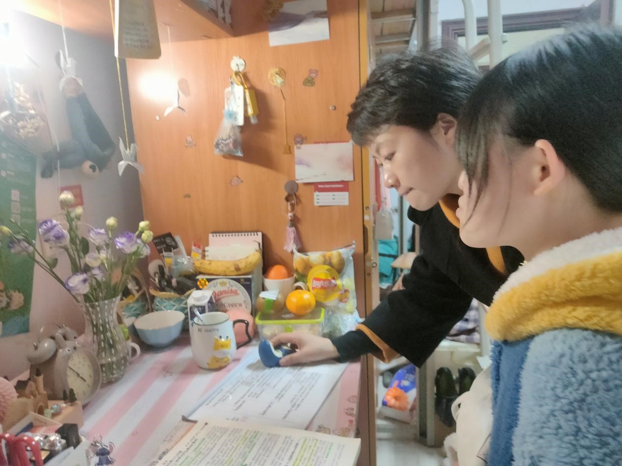 (新闻专业班主任陈睿在寝室与学生亲切交谈)
