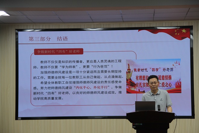 院长段胜峰对会议总结,教育引导全体教职员工牢记立德树人使命,坚守师德师风底线,以昂扬向上的精神面貌和教书育人的扎实行动投身工作。