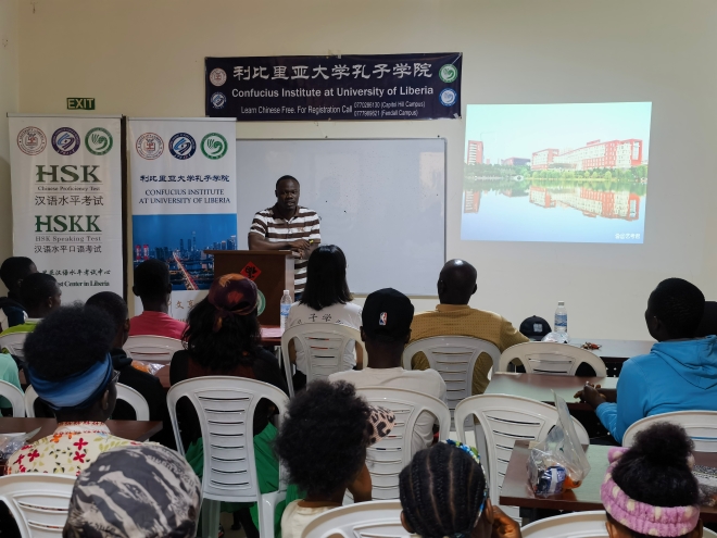当地时间8月10日,利比里亚孔子学院为即将赴华的学生召开行前座谈会。利大孔院利方院长Dexter Sumo、中方院长周红专、孔院全体教师、“汉语桥”世界大学生中文比赛全球总决赛的参赛选手和观摩选手、六名国际中文教育奖学金获得者及孔院暑假HSK培训班的学生共60余人参加了本次会议。