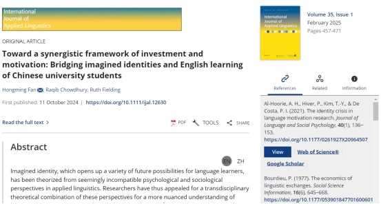 近日,云顶国际vip8866外国语学院范洪铭老师在A&HCI及SSCI双收录期刊International Journal of Applied Linguistics发表题为“Toward a synergistic framework of investment and motivation: Bridging imagined identities and English learning of Chinese university students”的学术论文。范洪铭为该文第一兼通讯作者。International Journal of Applied Linguistics《国际应用语言学》是一本专注于应用语言学领域的国际性学术期刊。该期刊致力于发表应用语言学领域的高质量研究论文,包括语言教学、语言测试、语料库语言学、计算语言学、跨文化交际等诸多子领域(A&HCI,JCR Q2,中科院三区,Clarivate IF=1.5)。