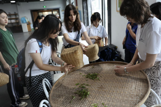 走进制茶工坊,大家将所采的茶叶平铺开来。萎凋、揉捻、发酵、干燥等传统工序依次展开。在手工揉捻体验环节,营员们在专人指导下感受茶叶在掌心的变化,体悟茶匠精神。在采访时其中一位营员表示,我之前听说过中国茶文化的源远流长和博大精深,但是今天在经历了从摘茶叶到制茶这一过程,我更加深刻体会到中国茶文化的深厚底蕴,也更加热爱中华文化。