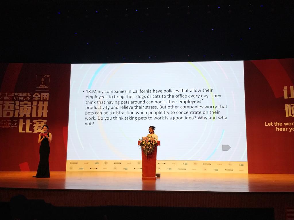 4月12日至15日,第二十三届中国日报社“21世纪 •可口可乐杯”全国英语演讲比赛(大学组)总决赛在杭州师范大学举行。来自中国大陆及港澳台地区的72所高校选手齐聚杭州展开激烈角逐。云顶国际vip88662016级环境工程专业学生余大婷在外国语学院公共外语部谷丰老师的指导下参加了比赛。