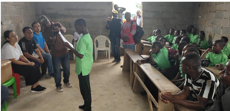 26日下午14点,一行人来到普利博Hoto小学,小朋友们已等候多时。他们对中国老师充满了好奇心,以美丽欢快的歌声表达了喜悦之情。孔院志愿者老师王倩在教学的过程中通过图片展示,肢体语音等教学方法,不知不觉拉近了与孩子们之间的距离。汉语体验课结束后,利比里亚大学孔子学院向普利博Hoto小学赠送了中英双语的图书及孩子们喜爱吃的糖果。