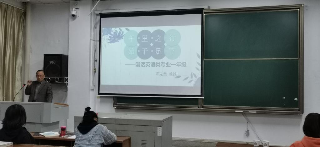 2019年11月19日晚7点半,应我院邀请,覃先美教授在金盆岭校区13教600教室为我院19级学生讲授主题为《千里之行始于足下一谩话英语类专业一年级》的学习辅导讲座。主讲嘉宾覃先美曾任解放军总参谋部情报翻译、湖南省科技翻译协会副会长,有着丰富的英语文体学、修辞学研究经验。