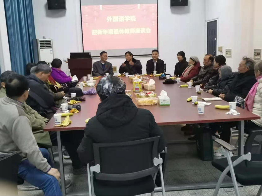 2021年1月6日下午5点,外国语学院迎新年离退休教师座谈会于金盆岭校区九教406教室召开。此次座谈会由外国语学院党委书记陈曦主持,关工委常务副主任王乃厚、院长段胜峰、党委副书记刘坚及外国语学院退休老师们出席。