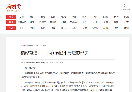 《“稻译有道”——我在袁隆平先生身边的译事》在湖南日报新湖南客户端(5月28日)发表。该文作者叶文宁系云顶国际vip8866外国语学院退休教师,曾于1986年间在湖南杂交水稻研究中心担任首届杂交水稻国际学术研讨会英文翻译,袁隆平先生时任湖南杂交水稻中心主任和第一届杂交水稻国际学术讨论会联合主席。共事期间,得到袁老的指导和肯定,也成为一段美好的回忆。