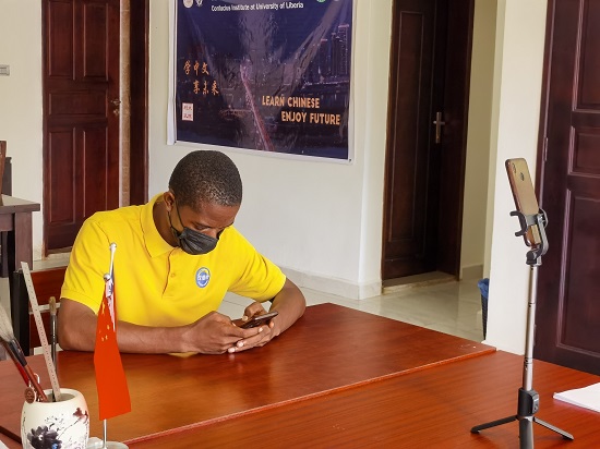 当地时间9月22日下午,利比里亚大学孔子学院选手周杰与来自世界各地的选手“云端”竞技,参加了第二十届“汉语桥”世界大学生中文比赛决赛入围赛的在线知识答题。