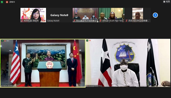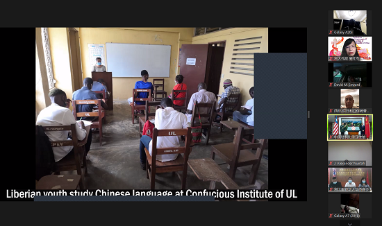 当地时间9月23日晚,中国驻利比里亚大使馆隆重举行国庆72周年视频招待会,利比里亚总统维阿等政要、各国驻利使节、在利各界友好人士、在利中资企业机构、华人华侨代表等出席了此次招待会。利比里亚大学孔子学院全体教师受邀出席,与各界人士一同庆祝中华人民共和国成立72周年。