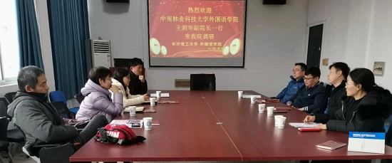 2022年1月5日下午,中南林业科技大学外国语学院副院长王润华率大学英语一教研室主任李红梅、大学英语二教研室主任杨立生和实验室主任何志钢等一行4人来我院调研。黄坚副院长率公共外语一教研室主任冯春和公共外语二教研室主任谷丰在金盆岭校区9号教学楼406会议室接待了兄弟院校同行的访问。