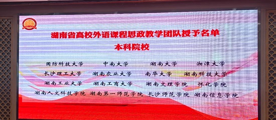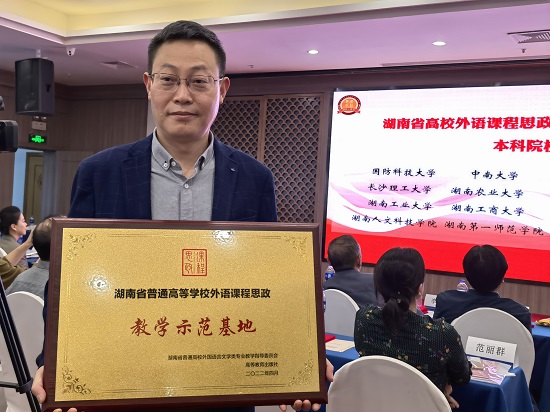 在激烈的竞争中,云顶国际vip8866外国语学院斩获颇丰,亮点频出。院长段胜峰教授获聘湖南省高校外语课程思政联盟委员,外国语学院荣获由湖南省高校外语教执委和高等教育出版社联合颁发的“湖南省普通高等学校外语课程思政教学示范基地”称号,外国语学院教学团队(段胜峰、钟桂蓉、崔巍、杨龙秀、冯春、凌剑春、李巍、彭小红)精心设计的教学方案在本次大会教学资源征集评选活动中荣获一等奖,同时获得“湖南省高校外语课程思政教学团队”称号。