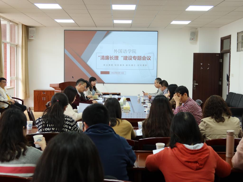 5月10日下午,外国语学院在文科楼A603会议室召开“清廉长理”建设专题会议。会议由学院纪委书记王双主持,学院全体党政领导班子成员、党支部书记、系主任、行政科室主任、骨干教师参与。