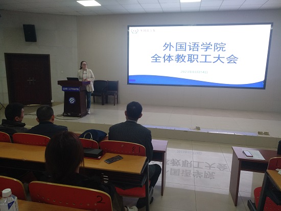 3月14日下午,外国语学院在云塘校区文科楼圆厅A-100学术报告厅召开新学期教职工大会,学习传达贯彻落实学校2023年党政工作例会(扩大)精神,对2023年重点工作进行部署,通报学院党委班子2022年度民主生活会召开情况。学院党政导班子成员、全体教职工参会。会议由院长段胜峰主持。