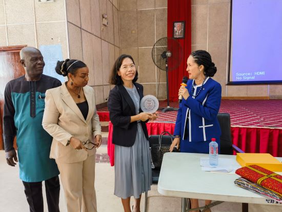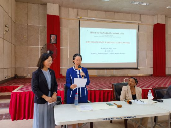 当地时间2025年4月25日,利比里亚大学在芬德校区召开了教职员工代表大会与大学理事会联席会议(Meeting of The Joint Faculty Senate and University Council),并于会上特别为孔子学院中方院长周红专举办了表彰仪式。会议由利比里亚大学校长蕾莉·马帕里安(Layli Maparyan)主持,全体副校长、学校教职员工代表、大学理事会成员、孔院全体教职员工共约100余人出席。