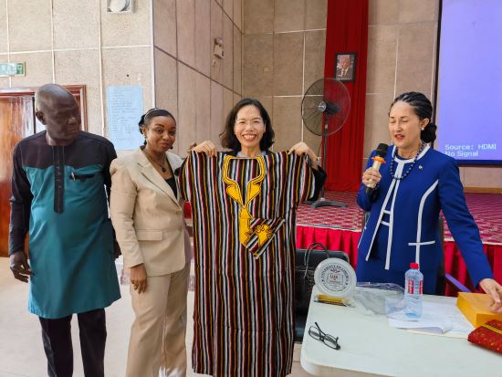 学术副校长泰勒赠予周红专院长利比里亚传统服装
