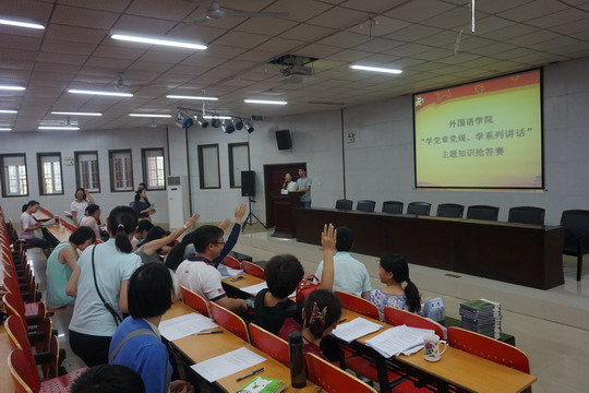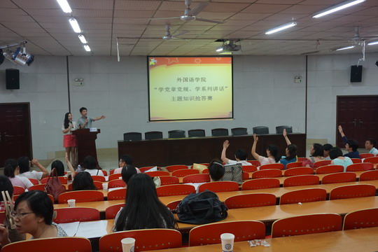 2016年9月27日下午4:00,外国语学院党支部于文科楼圆厅举办了“学党章党规、学系列讲话”教职工党员主题知识竞赛。此次竞赛由外国语学院学生党支部党员田帅、刘杨主持,全体外国语学院教职工党员参与竞赛。