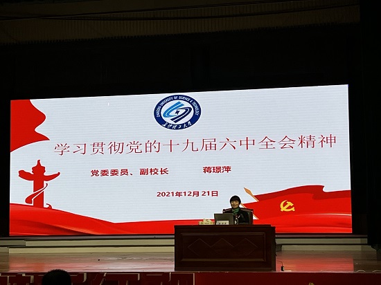 12月21日下午,校党委委员、副校长蒋璟萍在云塘校区大会堂为法学院、外国语学院、马克思主义学院三个学院师生一千余人宣讲党的十九届六中全会和湖南省第十二次党代会精神,外国语学院党委书记文丽丽主持会议。