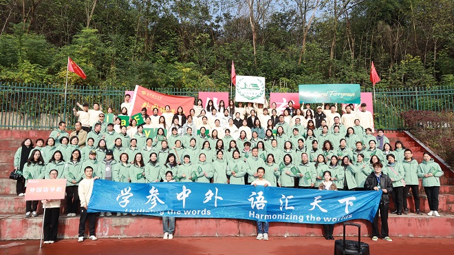 迈着自信步伐的他们,展现外国语学院的气宇轩昂喊出:“学参中外,语汇天下;文化摆渡,与理同行。”