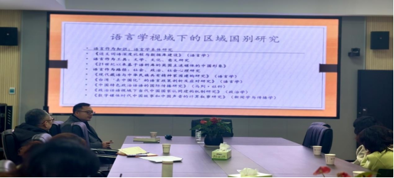 陈靓教授从当前国家对区域国别研究的需求出发,结合国家社科基金立项的成功案例,从“守正型拓展”和“外延型创新”两个维度,探讨了将区域国别研究与语言学、文学、翻译学、传播学、形象学等众多学科研究相结合,开展跨学科研究的可行性,并以大量现有研究课题为例,生动地阐述了开展跨学科研究的融合路径。他提出,外语学科应充分利用自身的学科优势,从文化民族性、知识生产等多个维度切入研究对象,丰富对对象国别与区域的研究成果。同时结合外语学科的理论优势,有效构建区域国别学的学科主体性和知识体系。他进一步强调,外语学科的科研规划需要拓宽视野,紧密结合区域国别研究,探讨跨文化交流、语言政策与区域发展等前沿课题。陈靓教授以具体案例和实践经验为切入点,分享了相关研究方法,为与会师生提供了兼具启发性和创新性的科研思路和方向。
