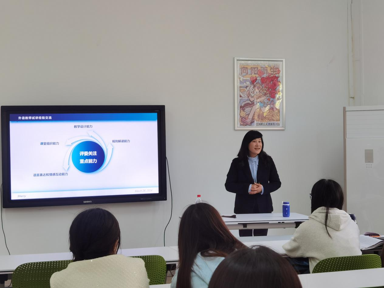 钟桂蓉针对外语教师试讲中评委关注的规则解读能力、教学资源整合能力、教学方法应用能力、语言表达和情感互动能力、课堂组织能力和教学设计能力这6方面重点能力进行解读分析。她讲述了社会情感能力的重要性,向在坐的“未来教师”们强调了笑容的感召力与影响力,她认为教师的笑容是最富有能量的语言,鼓励“未来教师”们用心、用情、用爱上好每一堂人生课。